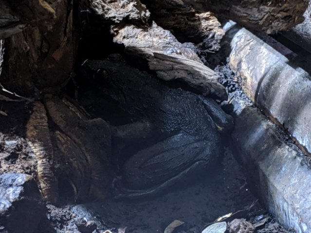 でろーんとしているアフリカウシガエル。最大24cm達する、手のひらよりも大きいカエル。両手でもってもこぼれ落ちそうなサイズ感です。
