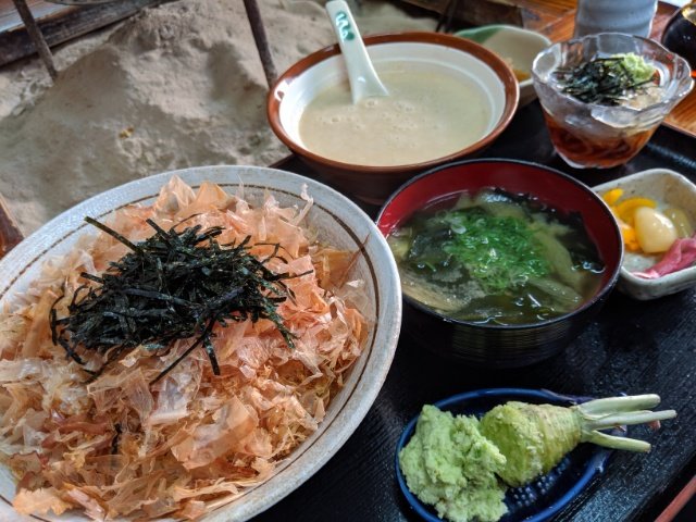 ついでに、すぐ近くのわさび丼の店「一休茶屋」でとろろ付きわさび丼(900円)も食べました!新鮮なワサビと鰹節で食べるお丼。ツーンとする刺激的なメニューです。