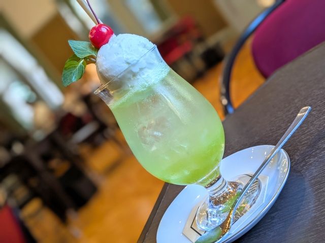 さてさて、注文したのは季節のクリームソーダ。月によってソーダの味が変わるメニュー、7月に訪問したところ「生メロン」がありました!