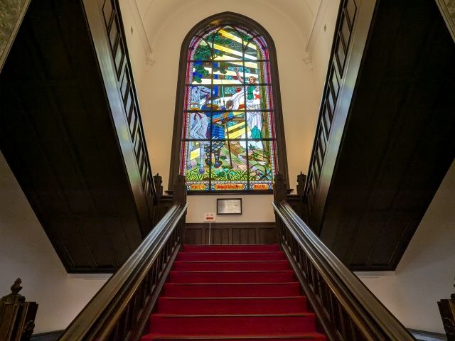 2階の展示室へ向かう階段には大きなステンドグラス。大正4年(1915年)に制作された原型を復元したものです。記された「Calamus Gladio Fortior」というフレーズはラテン語で「ペンは剣よりも強し」という意味。