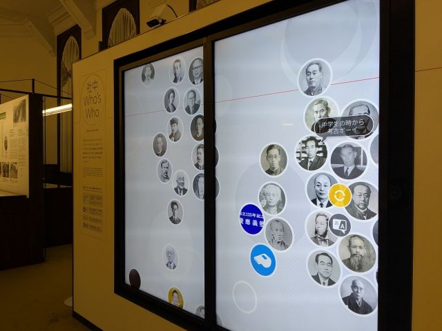 タッチパネル式のデータベース「社中Who’s Who」。人物アイコンにふれると、名前や出身地といった詳細が映し出されます。この人物アイコン、常に動いていたり、ときどき吹き出しでセリフが出たりと目を引く仕掛けがあります。