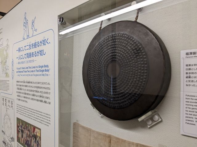 遺品の銅鑼。早朝5:00から2時間ほど塾生と散歩するのが日課であった福沢諭吉。この銅鑼はその出発時に合図として鳴らしていたもの。散歩中は塾生と会話しながら道行く人と交流しており、毎日会っていながらも福沢諭吉と知らなかったという人もいたそう。添えられたエピソードがいちいちユニーク。