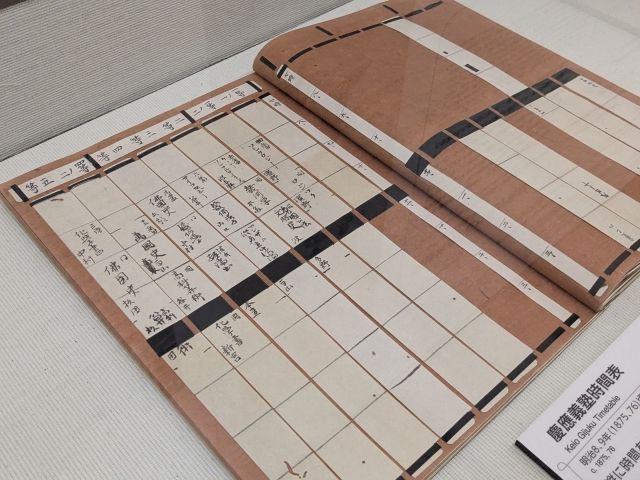 パネルによる紹介に加えて、様々な歴史資料も展示されています。こちらは慶應義塾時間表、今でいう時間割です。「國史」「文明史」などに加えて、「サイコロジー」「ソシヲロジー」「ロジック」といったカタカナの科目も。