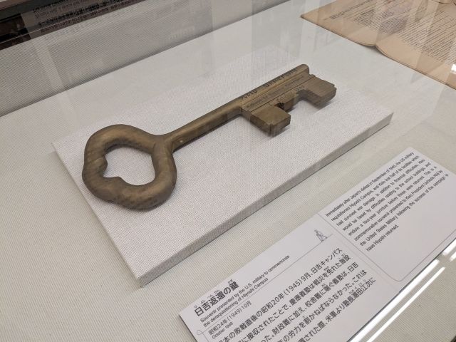 30cmを超える大きな鍵は日吉返還の鍵。太平洋戦争敗戦により米軍に接収された日吉キャンパス、運動の末に返還された際に、米軍より塾長に手渡された記念品です。