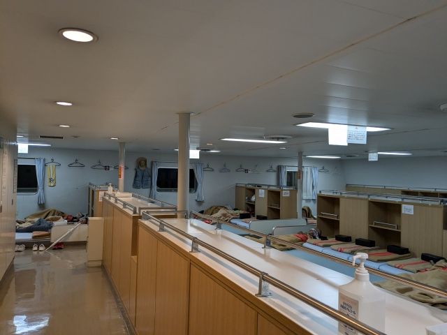 名瀬から乗船する場合、残る行き先は喜界島と鹿児島のみ。船内は空いており、行き先ごとの部屋区分もナシでした。
