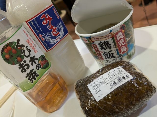 ランチョンにぎり、奄美風鶏飯スープ、みき、くび木のお茶という奄美感あふれるラインナップ。試しに買ってみたくび木茶は漢方のような独特の香りで長靴いっぱい飲みたいお味でした。