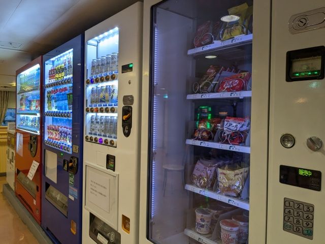 自販機は充実してます。ドリンク、お酒、カップヌードル、お菓子など。赤いきつねと緑のたぬきも置いてありました。