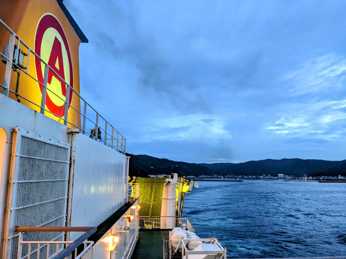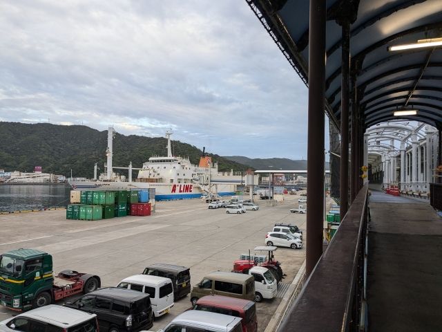 時刻表では20:30着ですが、受付には20:10との記載が!もしかして到着が早まったかと思いきや、結局着いたのは20:20頃。まあ大型フェリーは港に着いてもすぐに下船できるわけではないので、これくらいは誤差レベル。遅れなかっただけでもラッキーです!