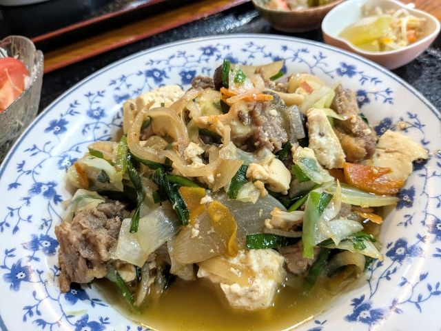 すき焼きというよりは汁だくな炒め物。味付けは甘口でタマネギやニンジンなどの野菜がとっても美味しいです。
