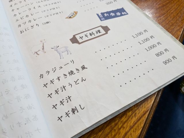 ヤギのカラジューリはありませんでしたが、「ヤギ汁」や「ヤギ刺」などヤギ肉を扱ったメニューはいろいろそろっています。珍しいものとしては、こちらのヤギすき焼き