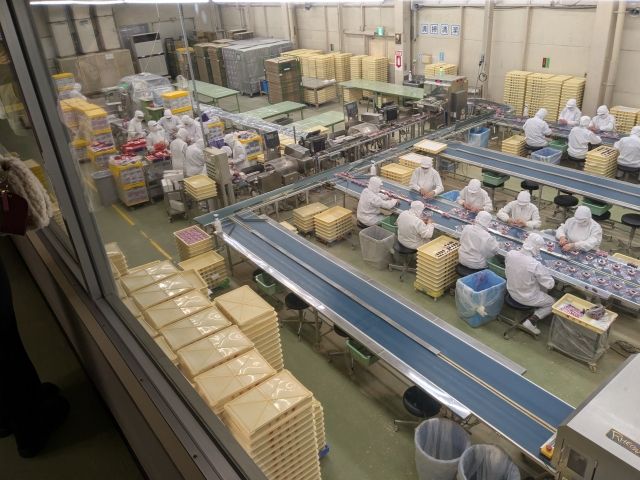 ときおりラインからはじいて黄色いトレイに除けているシーンも。何か基準に満たないものを除外しているのかと思いきや、作業が間に合わない場合に一時的に除けているようです。横並びのスタッフさんは、次の人に何個残すかが決まっているようで、間に合わない場合にいったんはじいているみたい。