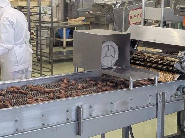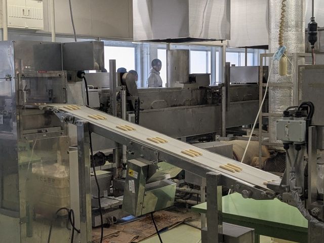 黒蜜をしみこませた和風ドーナツ「桔梗信玄棒」の工場も、わかりやすい名前の機械ばっかり。「しぼる君」と「カット君」によって仕上げられた生地が次々と進んでいきます。