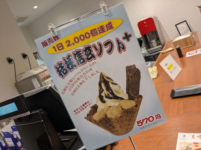 併設のカフェでは「桔梗信玄ソフト」や「桔梗信玄シェイク」を販売。すぐに食べたい場合はこちらがおすすめ。