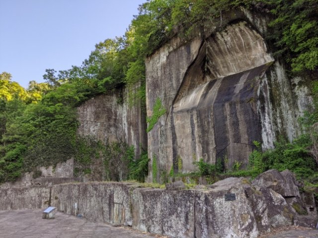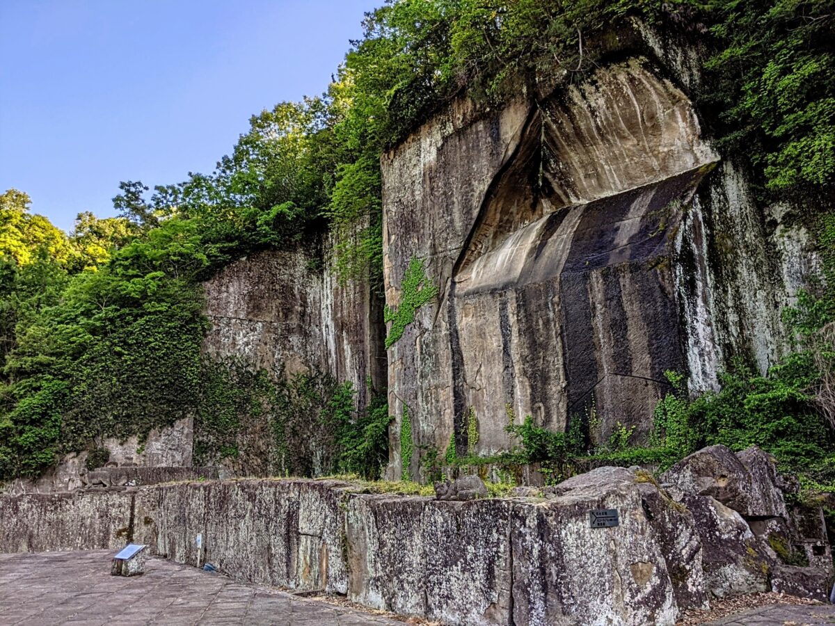 圧巻なのは博物館のすぐ隣にある採石場跡。こちらは「三才谷の大岩」と呼ばれた場所。高さ25mの断崖がそびえており、かなりの迫力です。