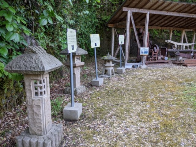 博物館の外にも展示が続いており、来待石の石燈籠や、石切に使用されたチェーンソーなどが並んでいます。