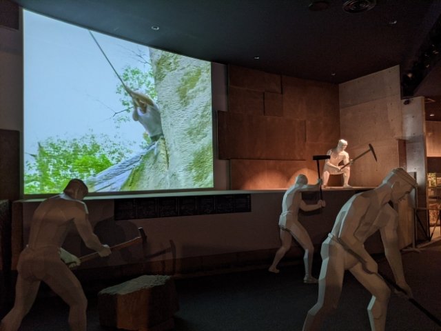 館内に設置された大きなスクリーンには、採石から加工までを行う石工職人さんの姿が映し出されます。