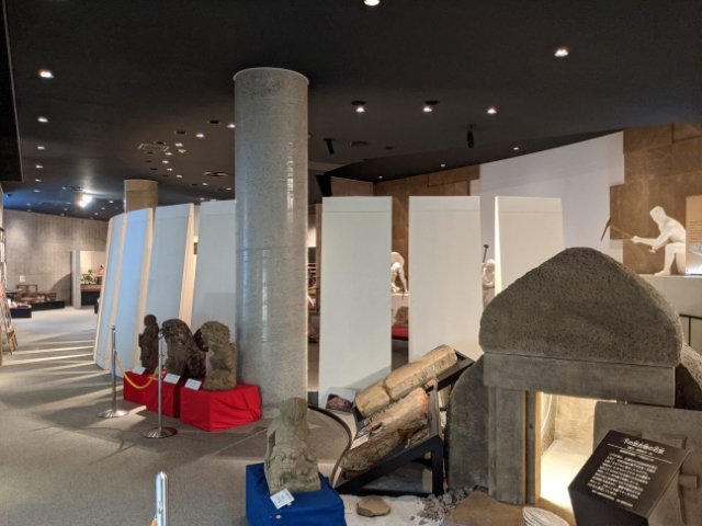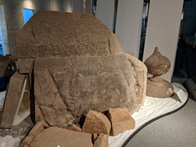 屋敷古墳の石棺や、お寺の屋根にとりつける擬宝珠など、加工品がずらり。石という素材は様々な場面で利用されてきたことがわかります。