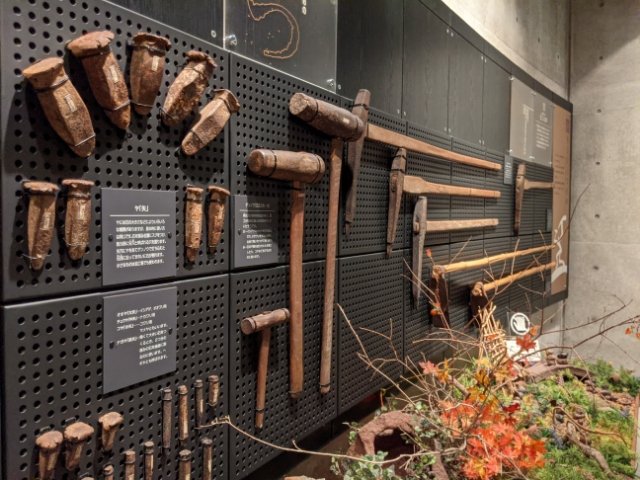 映像で使用されていた道具の実物も展示されています。楔のような「ヤ」と、それを打ち込むための木槌「ゲンノウ」など、使い方も解説されているためとってもわかりやすい。