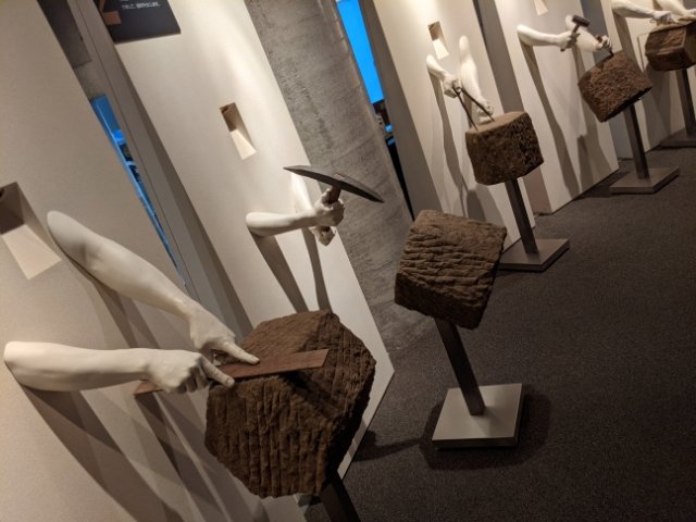 スクリーンの周辺では、映像の中で出てくる「キリヌキ」「イシワリ」といった作業の解説も展示されています。壁から生えた手がなんだかシュールですが、非常にイメージしやすい展示方法。より詳しく知りたい方はこちらを見ればいろいろとわかります。