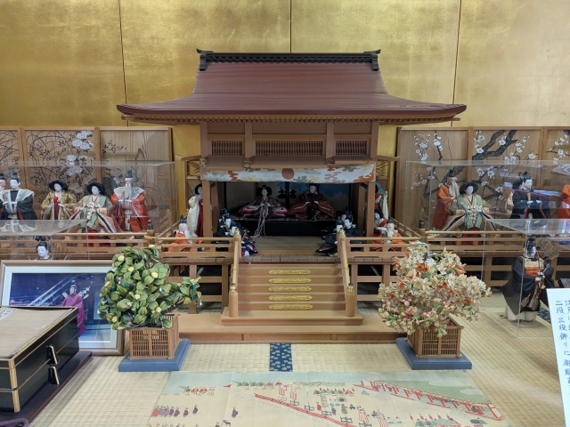 ずらりと並ぶ人形は、御殿飾り有職雛(ゆうそくびな)。朝廷や公家の儀式に携わる者「有職(ゆうそく)」の装束を忠実に再現した雛人形。御殿がついた豪勢なひな飾りです。