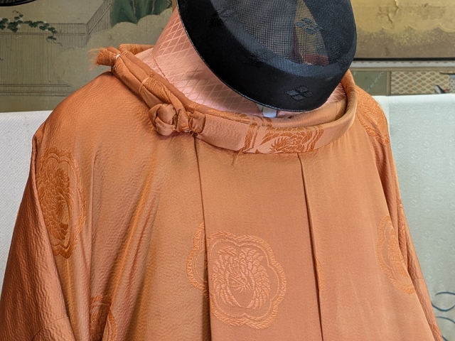 よく見ると、描かれているのは翼を広げて下へ向かうオシドリを描いた「鴛鴦文」。これも先ほどふれた皇太子専用の文様なのです。色や文様の知識が増えると、着物を見ただけでいろいろなことが読み取れるようになるのですね。
