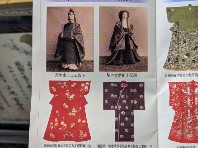 注目は昭和天皇の奥様の叔父・叔母にあたる、梨本宮守正王とそのお妃である伊都子妃の宮廷衣装。京都御所紫宸殿にて行われた大正天皇の即位式にて実際に着用したものが展示されています。