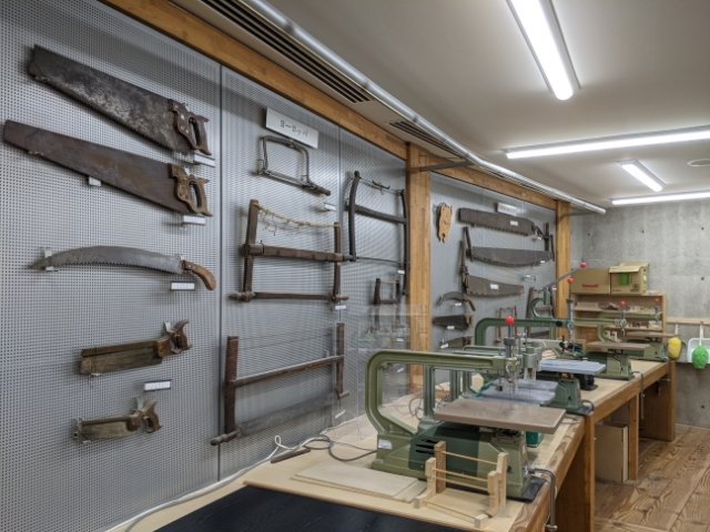 自然学習施設としての側面も持っており、組み木体験やカスタネット作成など、木材を使用した工作教室が開催されているそうです。館内の工作室は通常時でも見学可能で、壁に架けられた世界の大工道具を見ることができます。
