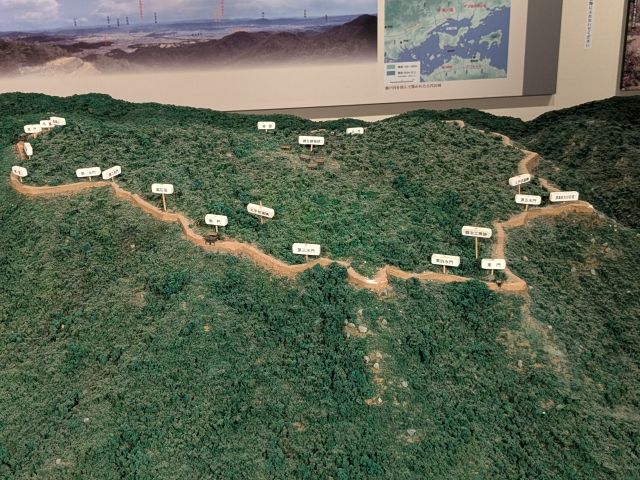 城の縄張を表したジオラマ。城壁は鬼城山の山頂を取り囲むように築かれており、その全長は2.8km。土塁のあいまに城門4ヶ所、水門6ヶ所、角楼1ヶ所で構成されています。城内の面積は約30ヘクタール!東京ドーム6.4倍という広大な敷地を持つお城なのです。