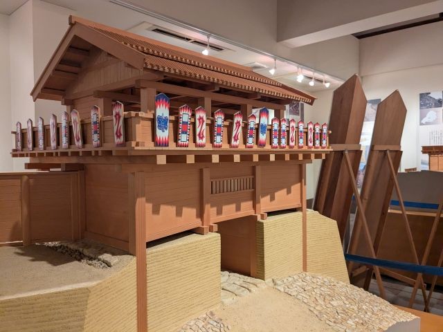 城門の模型も展示されています。お城ときいてイメージする、石垣や瓦屋根の近世城郭とは大きく異なる姿。