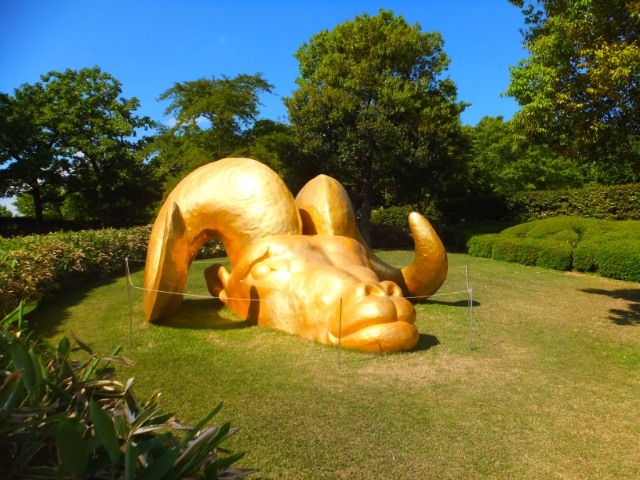 黄金に輝くひつじの頭。こちらは《RIGHT SHEEP 2012》by 椿昇。頭だけなのか、それとも体が地面に埋まっているのか。見えない部分を想像したくなりますね。