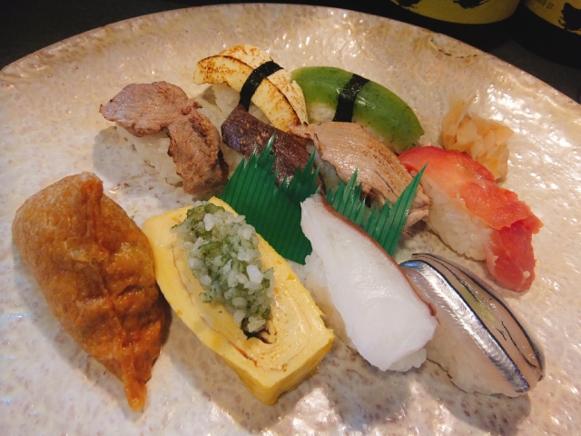 珍しい食材ではありませんが「コンニャク」と「豆腐」も新鮮。一見するとレギュラーメニューの「稲荷」と「玉子」ですが、シャリに緑茶が混ぜてあります。ひとつひとつにこだわりを感じる、贅沢なメニューです。