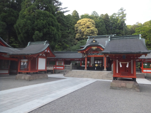 本殿・幣殿・拝殿が縦に並んでおります。それぞれ屋根の高さが異なっており、真正面に立つと多層建築のようにみえます。まるで要塞のような迫力です。