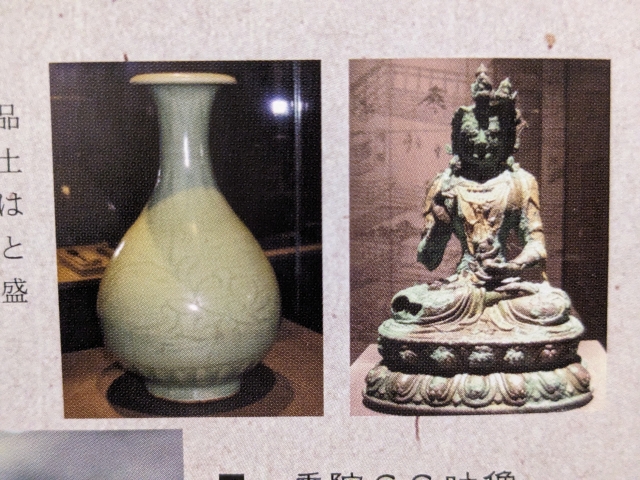 ここでは、破却を逃れた寺宝が展示されており、往時を偲ぶことができます。こちらの「青磁瓶(せいじへい)」は、坊泊小学校建設中に一乗院跡から出土したもの。