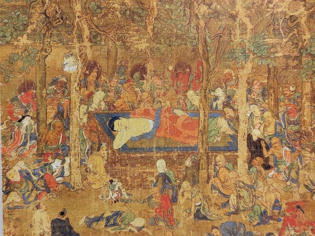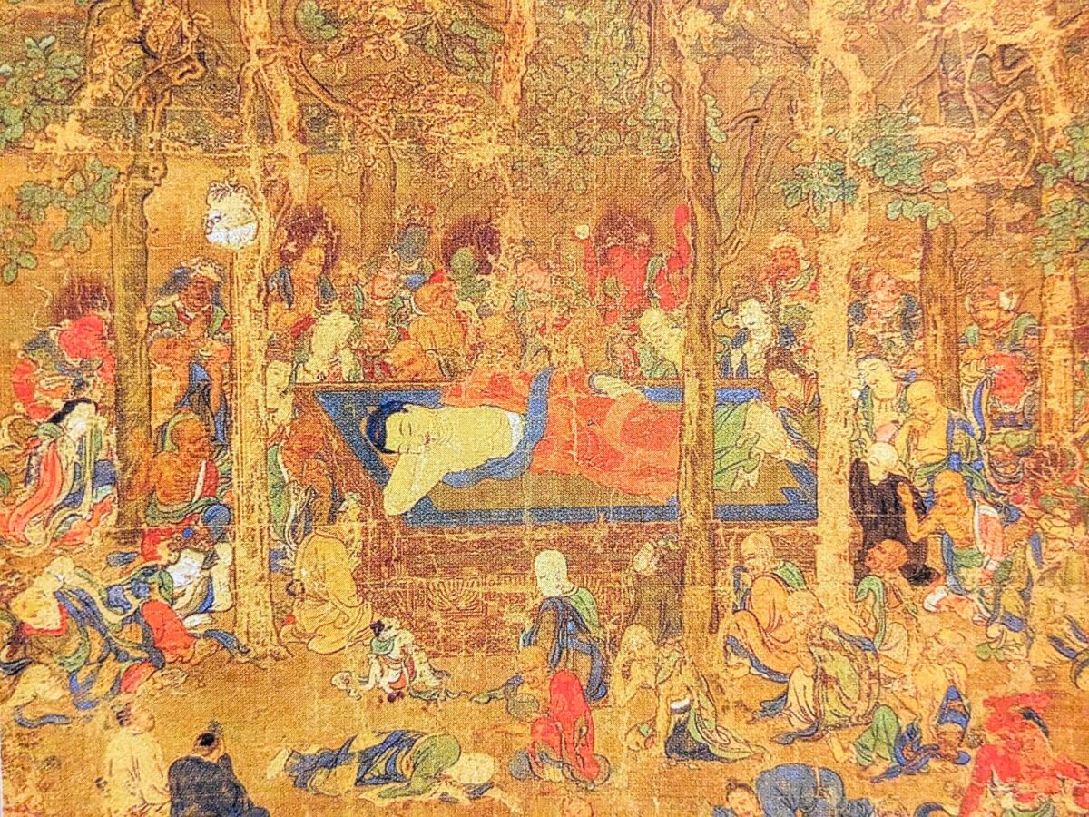インパクトがあるのが「絹本著色八相涅槃図」。縦2.9m、横2.64mという大きな仏教絵画で、釈迦の一生、さらに入滅後の出来事も描かれています。もともとは一乗院にあり、廃寺になってからは民間へ渡り、その後は龍巖寺に納められていたそう。非常にわかりやすい自動音声の解説もあり、ベンチに腰かけてじっくりと拝観することができます。