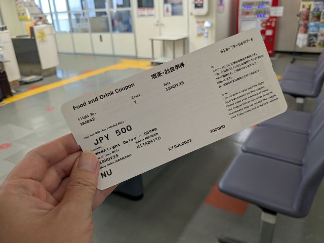 遅延のため空港内のカフェで利用できる500円クーポンをいただけました!