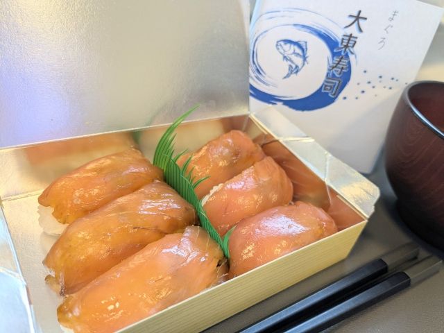 昨日はヒラメの「うふあがり寿司」を食べましたが、今日はマグロの「大東寿司」が入荷してました!ヒラメとは異なる食感、そしてマグロのあの風味を感じるお寿司です。