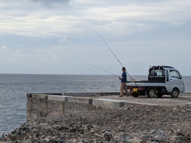 ここは夕陽スポットとして知られています。天気が良いと、大海原に沈む夕陽を拝むことができるそうです。そして、人気の釣りポイントでもあります。通常は船で沖へ出ないと釣れないマグロやガーラ(ロウニンアジ)が、陸地から狙えるそう。軽トラックに釣り竿をくくりつけて釣りしている人もおり、大物狙いということが伝わってきます。