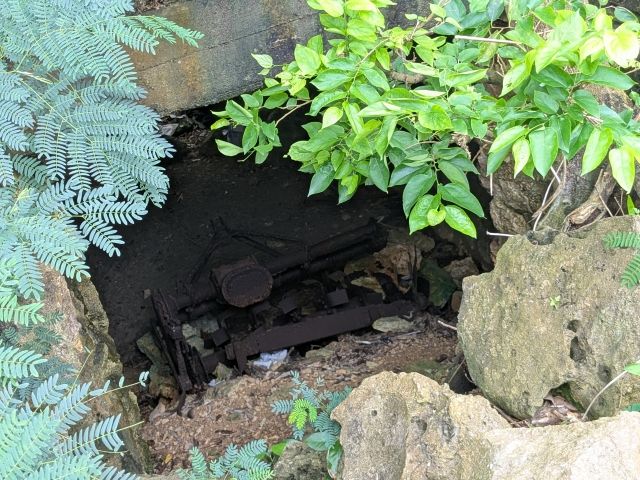 近くには防空壕らしき穴も。内部を覗いてみると、錆びついた機械が置かれています。