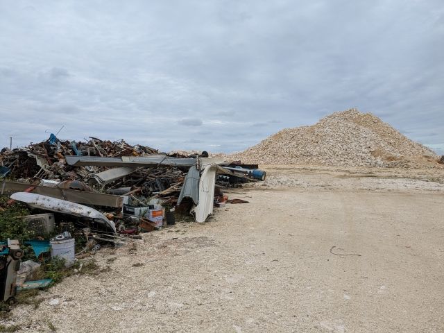 廃材が積み上がる、荒涼とした風景。車のパーツ、デスク、台車、エンジン、一斗缶、扇風機など、廃棄場定番のラインナップがそろっています。強い風を受けて、トタンがパンパンと音を鳴らしていました。
