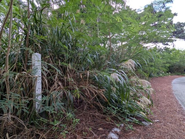 道端の草むらをよく見ると、白い標柱を発見しました!どうやらこの辺りがビロウ林のようです。
