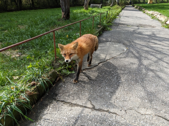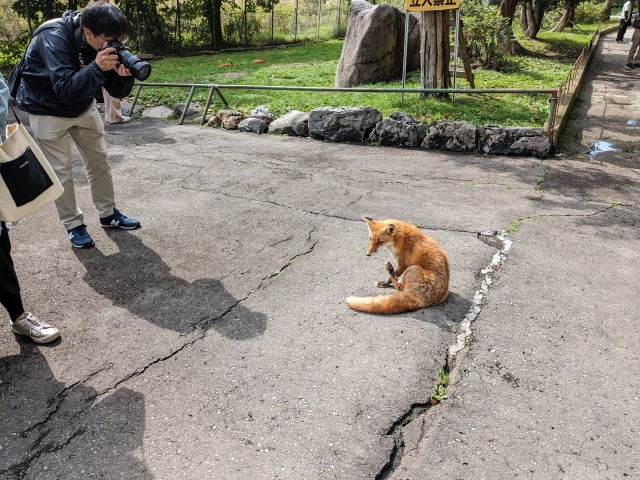 フェンスで囲まれた園内に入ると、いきなり登場するキタキツネ。人慣れしているのか、近づいても全く逃げる気配がありません。それどころかカメラに向かってポージングしているようにも見えます。