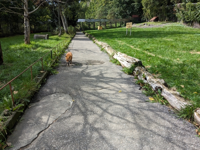 低めの柵や丸太に囲われた通路が延びる園内、この通路が自由に歩けるルートでそれ以外の部分は立入禁止と。人慣れしてないキツネは通路から遠くに隠れてます。