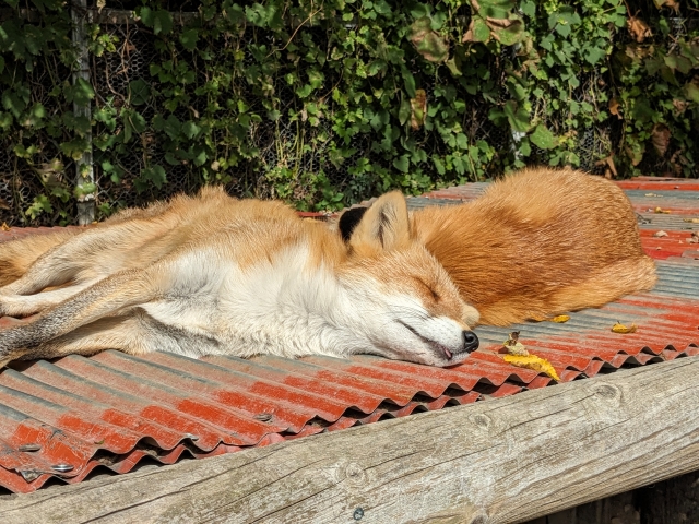 夜行性なので、日中は寝ているキツネが多いです。ぐでーんとしている姿もとってもかわいらしいですね。