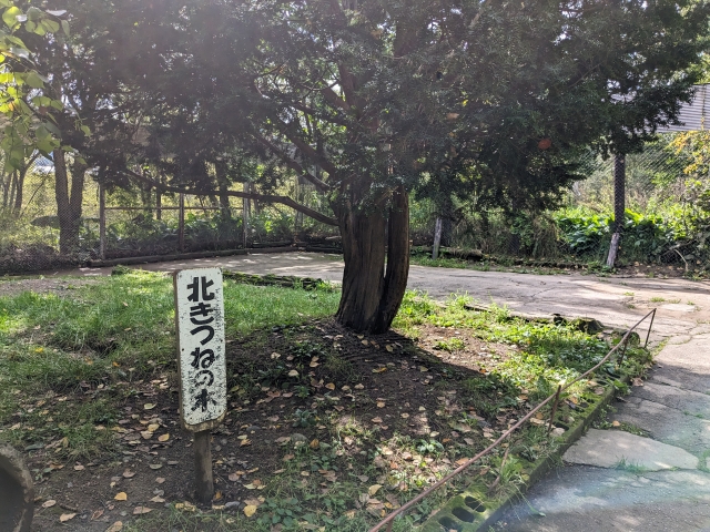 「北きつねの木」という名がつけられた樹木。実はこの木はキタキツネのお昼寝ポイント。運が良いと、キツネが実っていることがあるそうです。