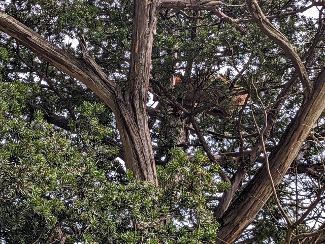 キタキツネの木ではありませんが、別の木の上にいる姿を見かけました。園内を歩く際は頭上も要注意です!(※写真右上の赤茶色がキツネです)
