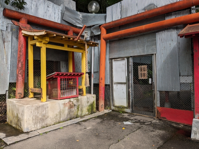 写真左側の鳥居は北きつね神社。本来はこの鳥居の先に参道が延びていたそうですが、現在は立ち入り禁止となっています。運が良いと、鳥居のそばや賽銭箱の上に寝そべるキツネが見れることもあるそう。