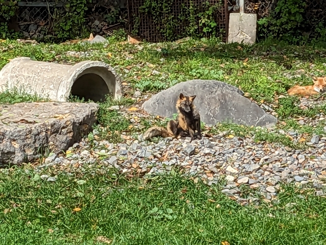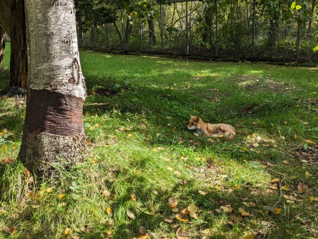 9月末に訪問したため、キツネたちはすらっとした夏毛の姿。冬に訪れると、もっとモフモフした冬毛の姿を見ることができます。