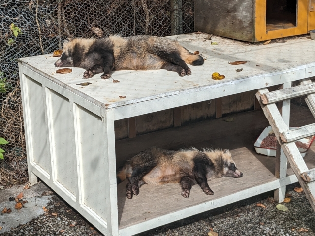 このタヌキはエゾタヌキと呼ばれる北海道の固有種。私が訪問した際は檻の中で寝転がっている状態でしたが、場合によってはキツネとともに放し飼いエリアを歩いていることもあるそう。