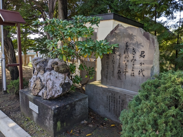 こちらは国歌「君が代」の碑。国旗・国歌法制化を記念して、2000年に豊受毘賣神合祀五十年記念事業として建立されました。すぐ側には、歌に出てくる「さざれ石」も置かれています。