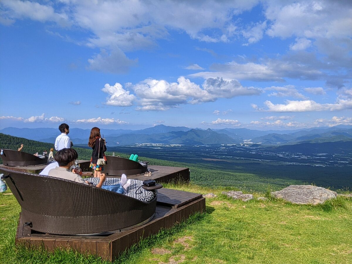 リフトに乗って向かう標高1,900mの清里高原山頂。そこに広がる清里テラスは、開放的な屋外カフェスペース。オリジナリティあるスイーツやドリンク、そしてラグジュアリーなソファシートと、写真映え要素がたっぷり詰まった話題性抜群なスポットです。
